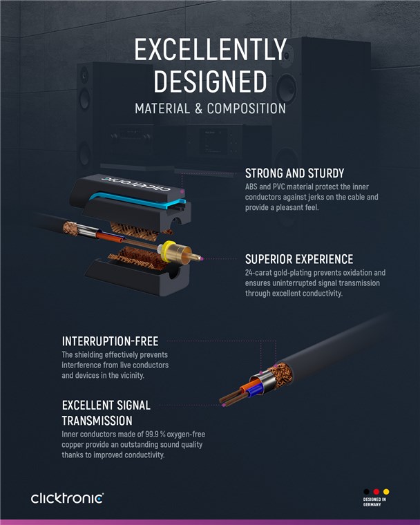- Clicktronic-Audiokabel mit 2‐fach Schirmung aus Aluminiumfolie und Kupfergeflecht für eine brillante Signalqualität