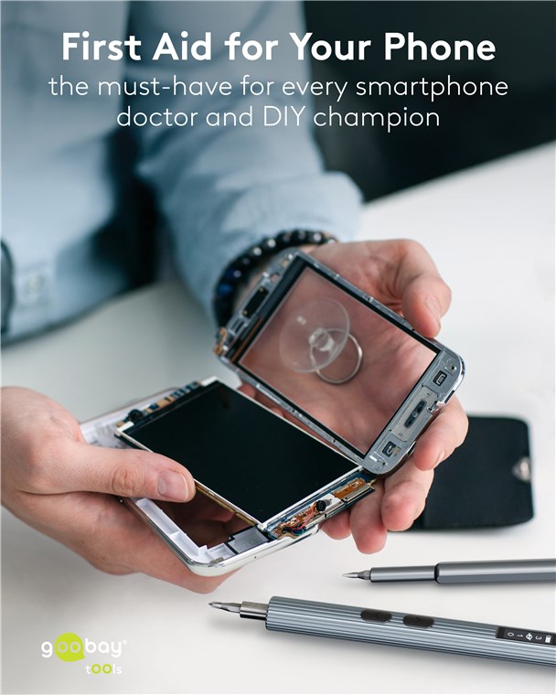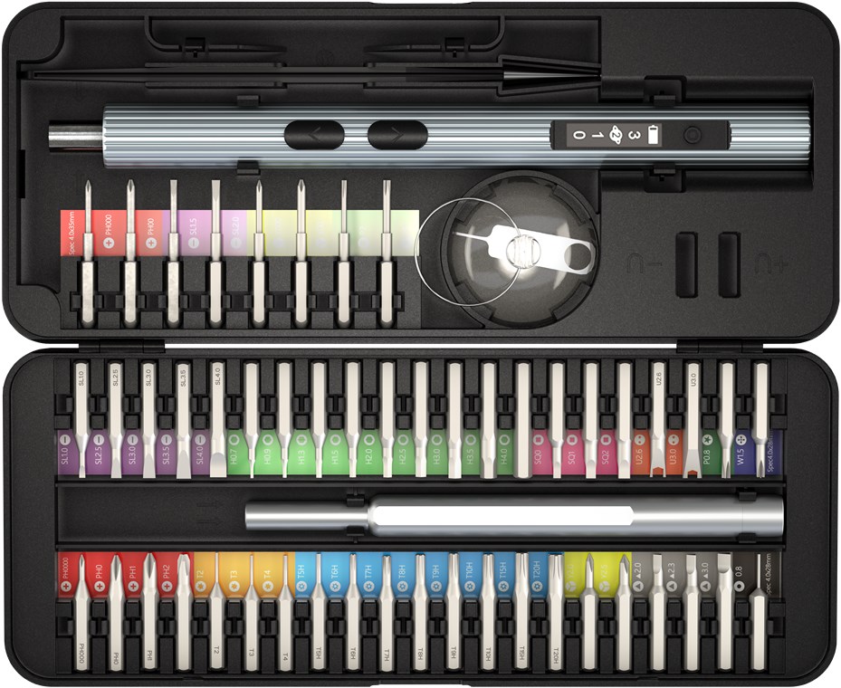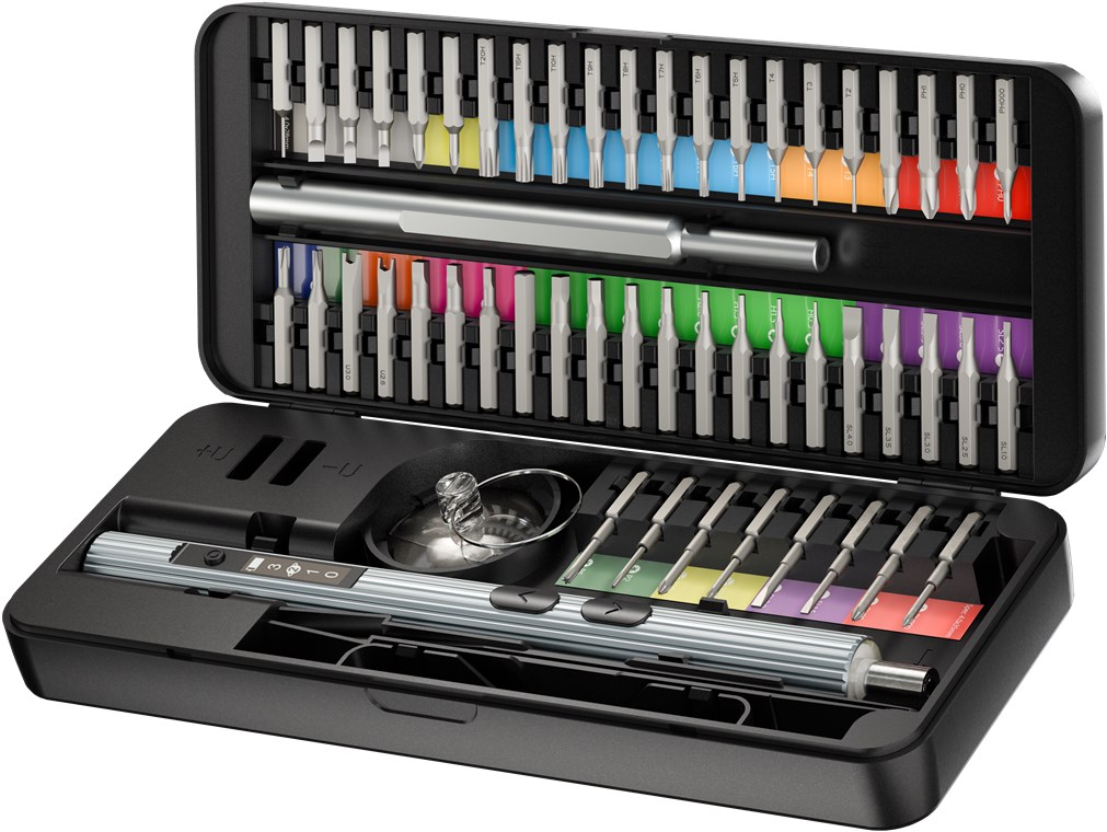 42x 28 mm Bits, 8x 35mm Bits, Aufbewahrungsbox, Ladekabel USB-A auf USB-C™, manueller Schrauber & Hebel, Pin, Pinzette, Saugnapf, Schraubendrehergriff mit Magnethalter