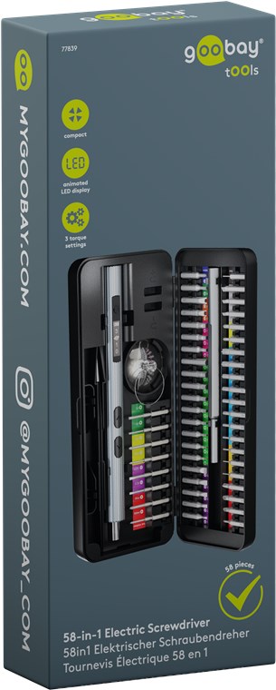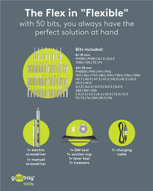 - Inkl. 50 Bits (28 mm, 35 mm): 8x Kreuzschlitz (P, PH), 11x Innensechsrund (T, TH), 9x Sechskant (H), 7x Flachschlitz, 1x 5-Punkt, 4x Tri-Wing, 3x Dreikant 3x Vierkant, 2x Spanner (U), 1x Holzbohrer (W), 1x Through-Pin