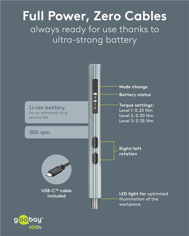 - Schraubendreher mit USB-C™-Anschluss zum Aufladen, inkl. Ladekabel 0,5 m (USB-C™ auf USB-A)