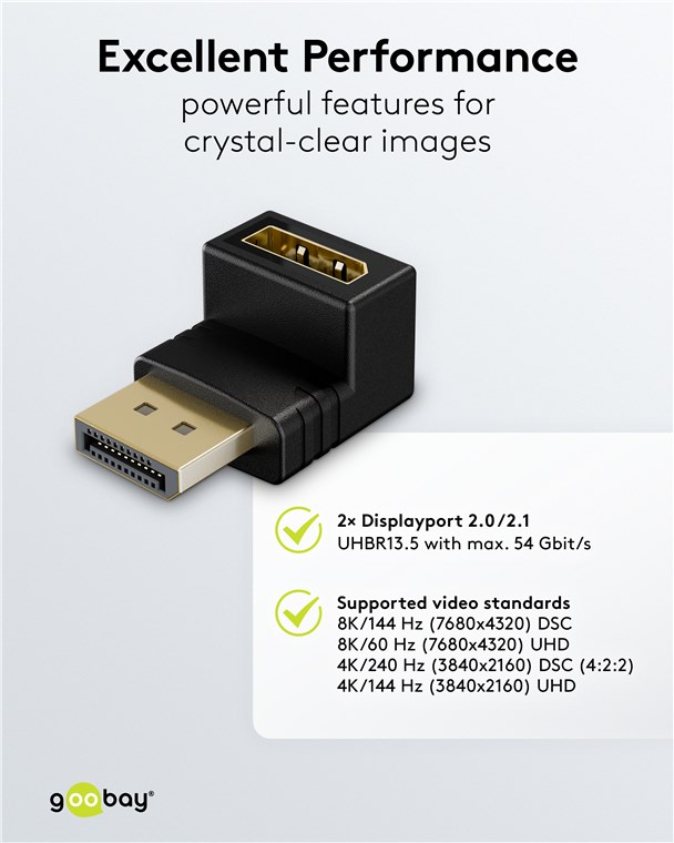 Mit ultrahoher 8K-Bildauflösung für gestochen scharfe Bilder und hochfrequenter Multimonitor-Funktion ist der DisplayPort™-Adapter die perfekte Wahl für immersives Gaming und fesselnde Home-Entertainment-Erlebnisse. Der Adapter liefert mit UHBR13.5 besonders hohe Datenraten für eine verbesserte HDR-Unterstützung und damit für eine höhere Farbtiefe und schärfere Kontraste.