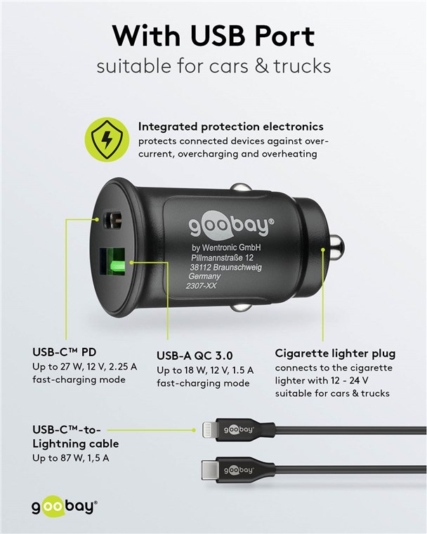 - Die integrierte Schutzelektronik des Kfz-USB-Adapters sichert angeschlossene Geräte gegen Überstrom, Überladung und Überhitzung