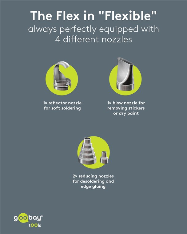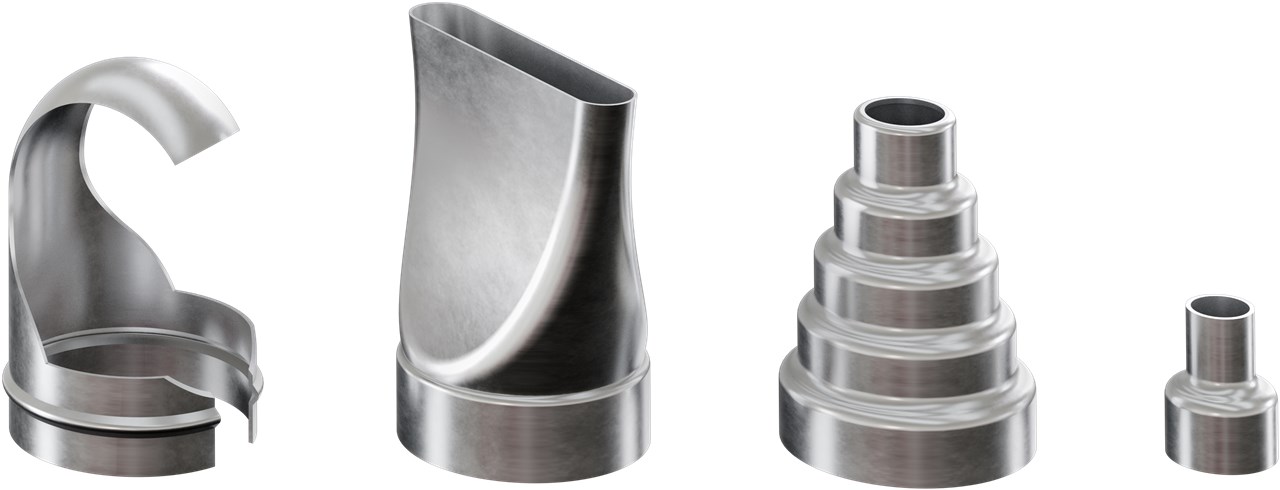 - Vier Vorsätze inklusive: 1x flache Abstrahldüse für das Ablösen von Aufklebern oder trockener Farbe, 1x schaufelförmige Reflektordüse zum Weichlöten, 2x schmale Reduzierdüsen zum Entlöten oder Kantenleimen