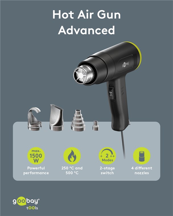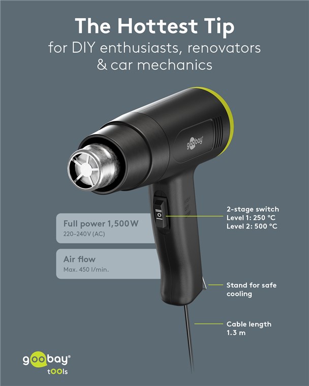 Die Heißluftpistole ist der heißeste Tipp im Heimwerkerbereich. Flexibel einsetzbar mit vier verschiedenen Aufsätzen ist sie der praktische Helfer bei zahlreichen Reparaturarbeiten, z. B. bei der Kabelverlängerung mit Schrumpfschlauch und beim Entlöten und Umformen von dünnen Metall- oder Plastikrohren.