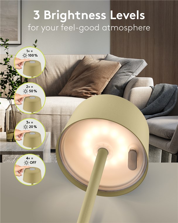 - Durch leichtes Antippen der Oberseite wechselt die LED-Lampe zwischen drei Helligkeitsstufen und dem Off-Modus