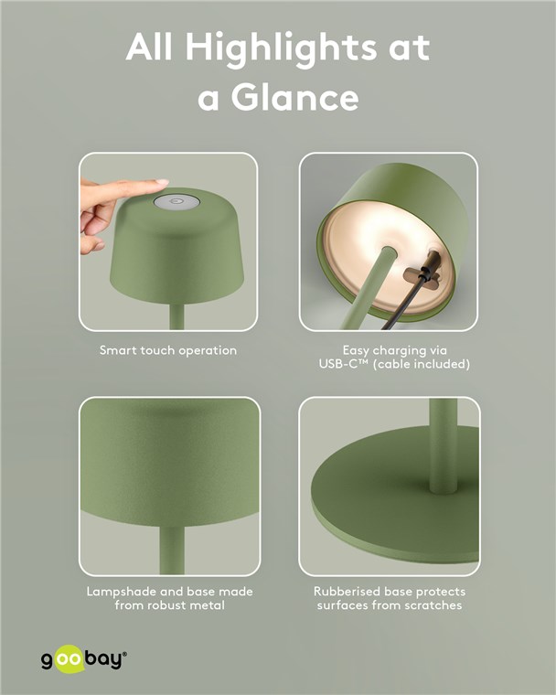 Die kleine Tischlampe veredelt mit ihrem reduzierten, skandinavischen Design jedes Wohnzimmer, Schlafzimmer oder Esszimer und setzt auch auf der Gartenparty ein Style-Statement. Gefertigt aus hochwertigem, massivem Metall, steht die innovative Goobay-Leuchte für Qualität und Langlebigkeit.