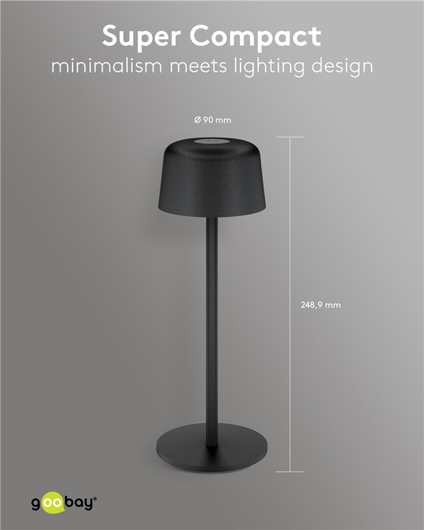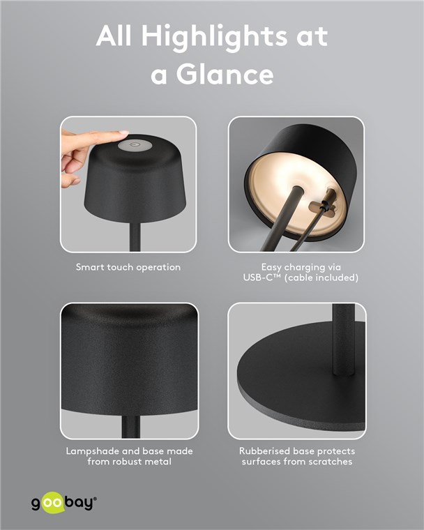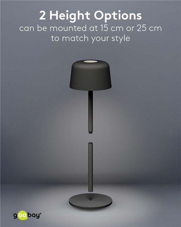Die kleine Tischlampe veredelt mit ihrem reduzierten, skandinavischen Design jedes Wohnzimmer, Schlafzimmer oder Esszimer und setzt auch auf der Gartenparty ein Style-Statement. Gefertigt aus hochwertigem, massivem Metall, steht die innovative Goobay-Leuchte für Qualität und Langlebigkeit.