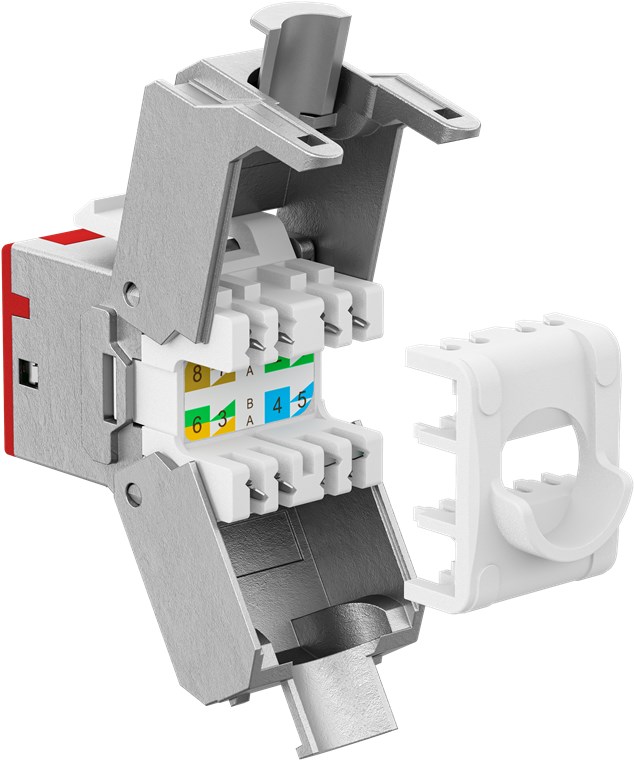 - Die feldkonfektionierbare RJ45-Buchse ist nur für Volldraht von 0,45–0,65 mm Durchmesser und nicht für Litzendraht geeignet