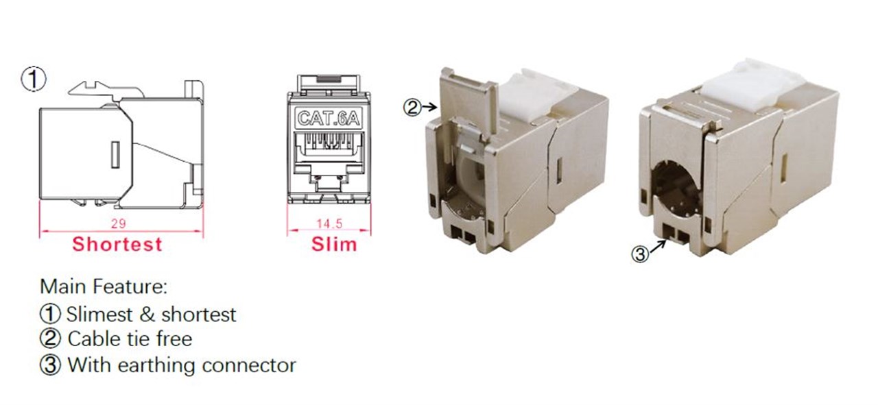 Keystone-Modul RJ45 CAT 6A, STP, Slim & Short, Erdungsklemme