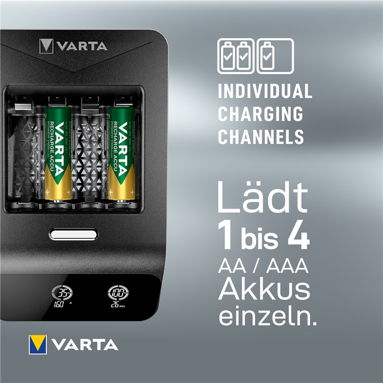 - Ladegerät für 1-4 wiederaufladbare AA-Batterien oder AAA-Batterien - 4x VARTA AA-Akkus mit 2100 mAh sind im Lieferumfang enthalten