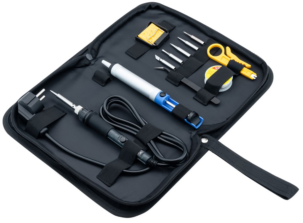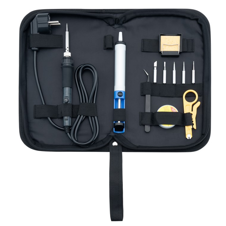 mit Lötkolben, 5x Wechsel-Lötspitzen, Lötkolbenhalter, Entlötpumpe, Abisolierer, Pinzette, Lötschwamm und Lötzinn