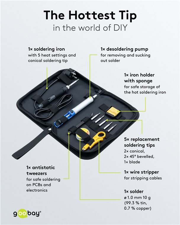 - 1x Lötzinn ø 1,0 mm 10 g (99,3 % Zinn, 0,7 % Kupfer), 1x Abisolierer zum Abmanteln von Kabeln, 1x Lötkolbenhalter mit Schwamm für die sichere Ablage des heißen Lötkolbens