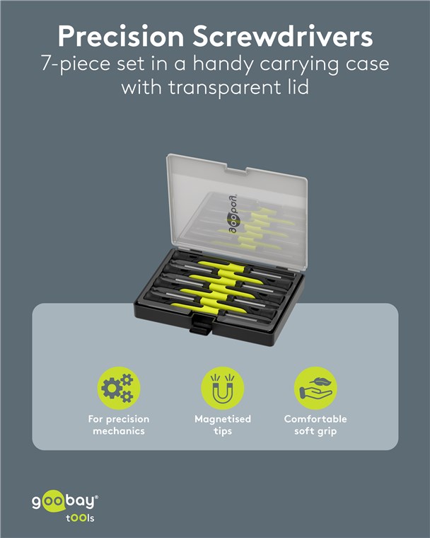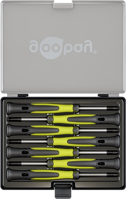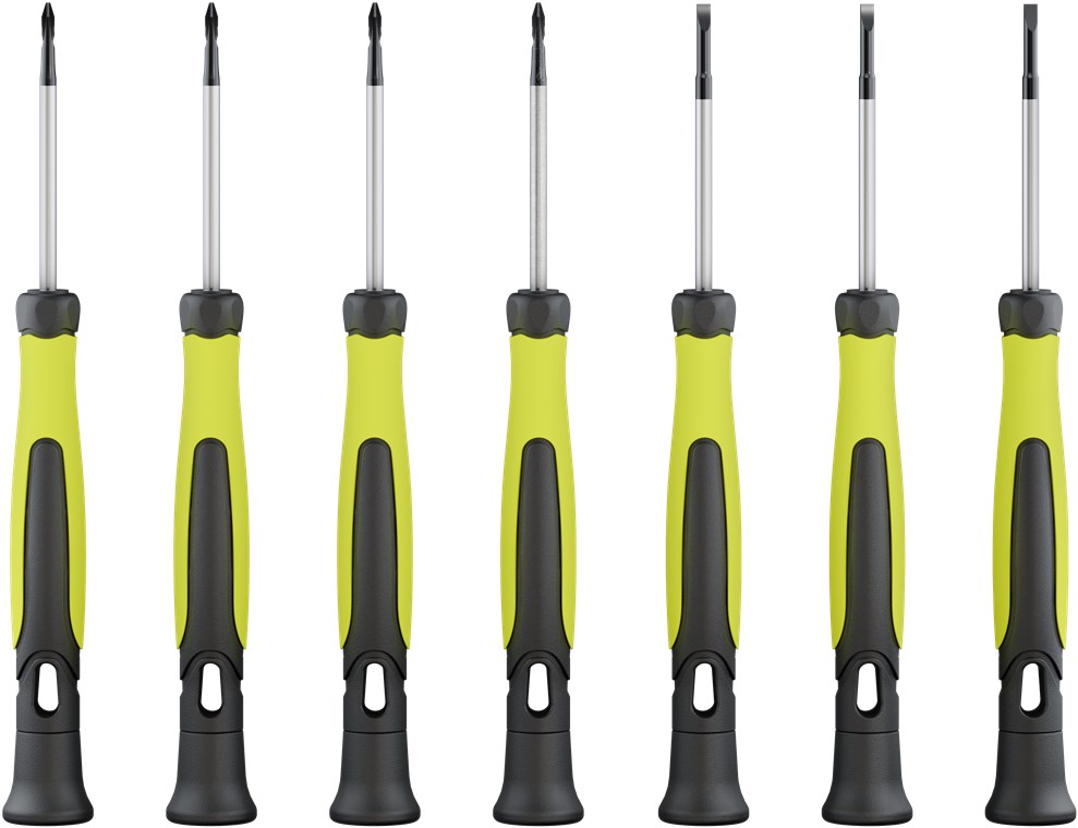 7 Schraubendreher (2x Flachschlitz (2 mm, 3 mm), 3x Kreuzschlitz (PH0, PH1), 3x Innensechsrund (T6, T8, T10) ), Aufbewahrungsbox