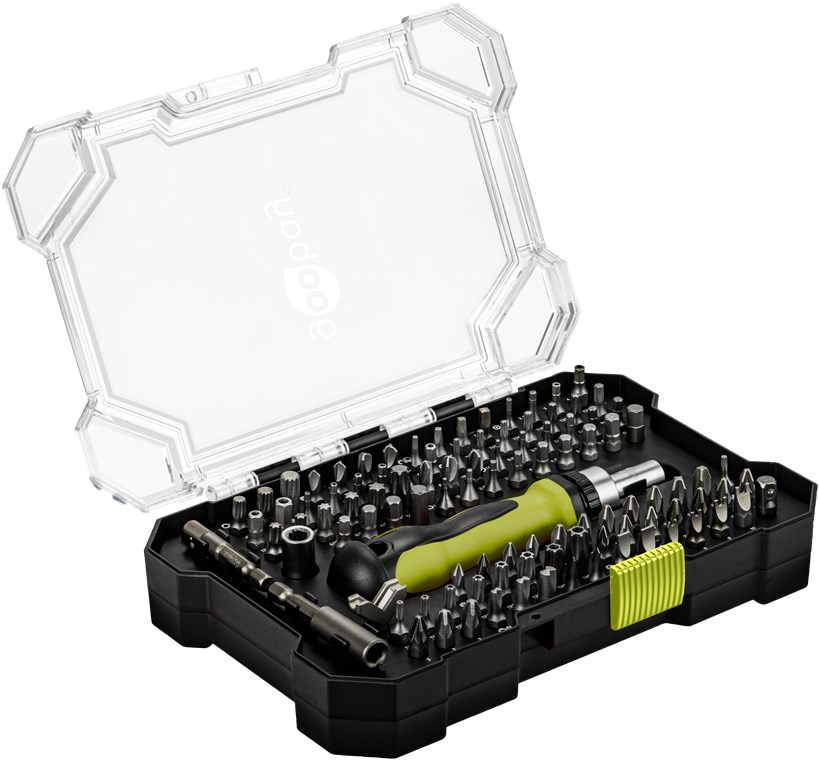 - Inkl. 99 Bits aus stoßfestem S2-Stahl: 4x Flachschlitz, 24x Kreuzschlitz (PH, PZ), 22x Innensechsrund (T, TH), 4x Tri-Wing, 4x Vierkant, 31x Hexagon (H, Hex Pin), 3x 12-Punkt (M), 3x Clutch (C ), 4x Spanner (U)