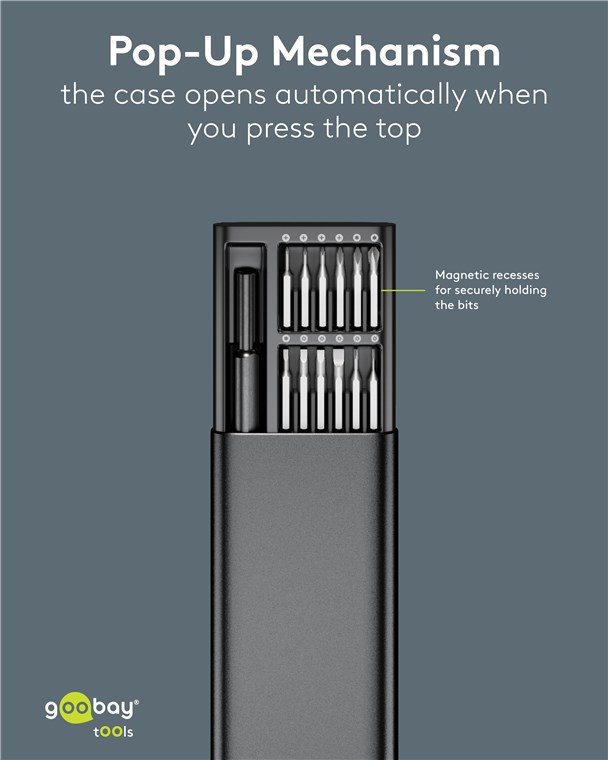 • Hochwertiges Schraubenzieher-Set aus beschichtetem Aluminium in einem Metall-Case mit komfortablem Pop-up-Mechanismus