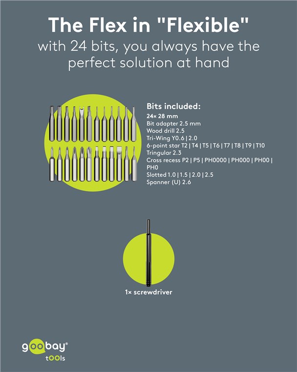 • 1x 2,5 mm Adapter, 8x Innensechsrund (T, TH), 1x Dreikant (2.3), 6x Kreuzschlitz (PH, P), 4x Flachschlitz, 1x Spanner (2.6), 2x Tri-Wing (0.6, 2.0), 1x Holzbohrer (2.5)
