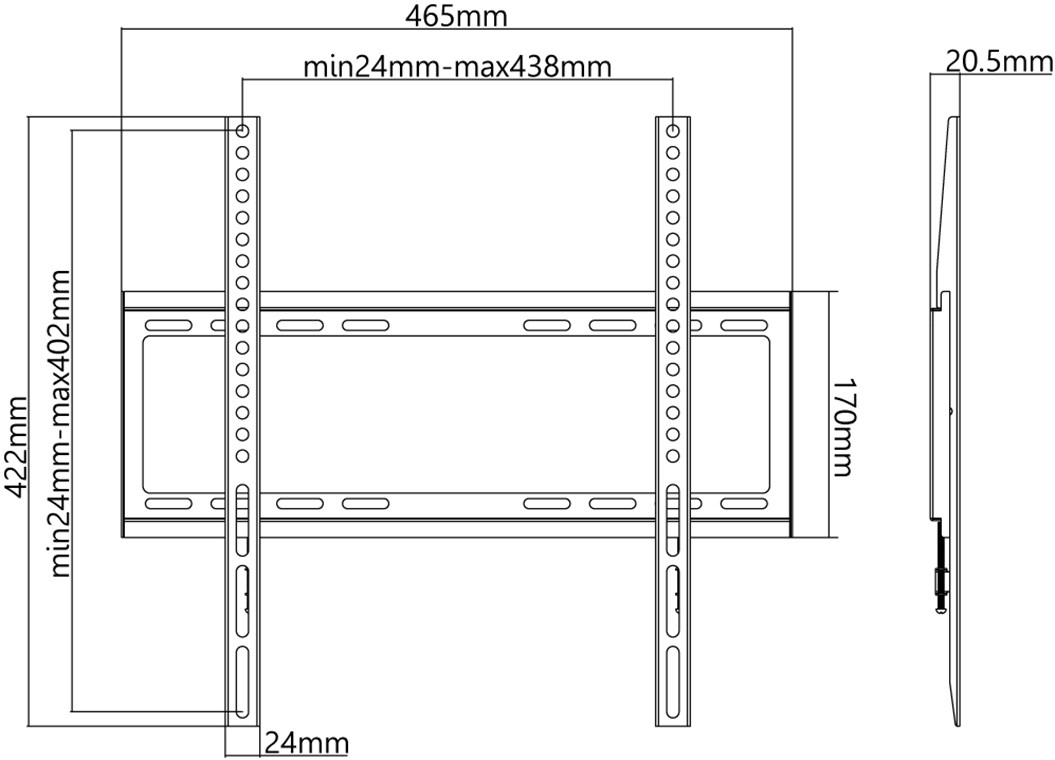 Die TV-Wandhalterung ist für jeden 32-55 Zoll (81-140 cm) Fernseher bis 35 kg ausgelegt. Das superschlanke Design steht nur 20,5 mm von der Wand entfernt, um den eleganten Look von ultradünnen Fernsehern zu vervollständigen. Es zeichnet sich durch eine offene Gestaltung aus, die den Luftstrom zu den Geräten maximiert und einen einfachen Zugang zur Rückseite der Komponenten ermöglicht. Darüber hinaus lässt sich der Fernseher auf der Wandplatte nach links und rechts verschieben, um ihn so genau an der gewünschten Stelle zu positionieren.