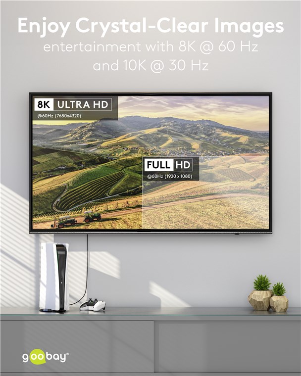 - Das HDMI™-Kabel erreicht gestochen scharfe UHD-Auflösungen von bis zu 8K @ 60 Hz und 4K @ 120 Hz (abwärtskompatibel)