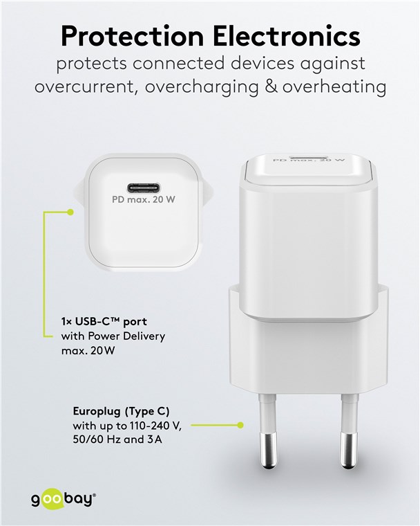 - Die integrierte Schutzelektronik des USB-C™-Ladegeräts sichert angeschlossene Geräte gegen Überstrom, Überladung und Überhitzung
