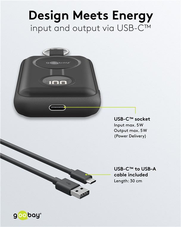 - Die Wiederaufladung der Powerbank erfolgt über den kombinierten USB-C™-Eingang/-Ausgang (inkl. Ladekabel USB-C™ auf USB-A, 0,3 m)