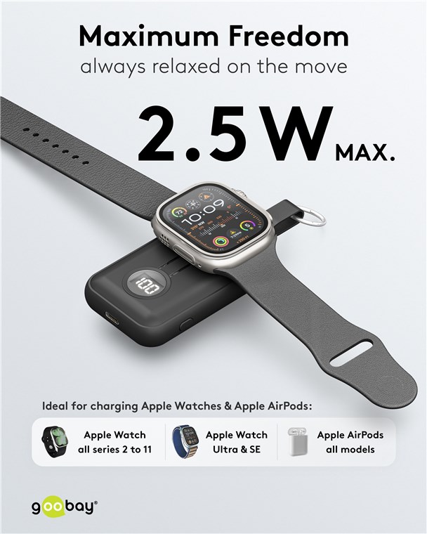- Ideale Leistung für die Apple Watch: 2.500 mAh für bis zu 8x laden (modellabhängig) – wireless mit bis zu 2,5 W und über Kabel extraschnell mit bis zu 5 W