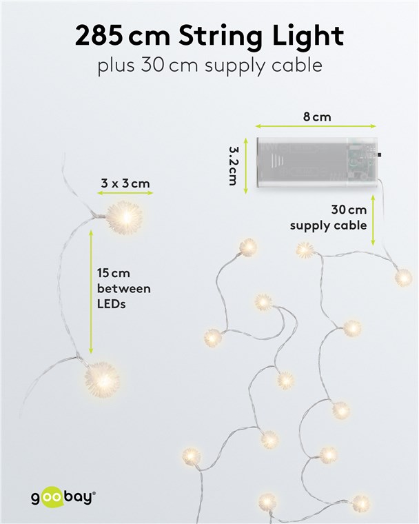 - Total length: 3.15 m, supply wire: 30 cm, distance between LEDs: 15 cm, transparent cable