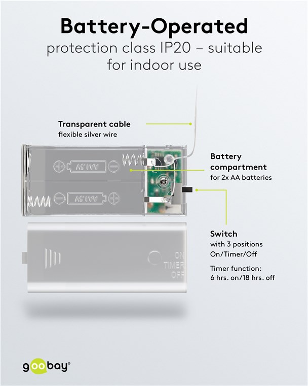 - LED string light with timer function: 6 hrs. on/18 hrs. off, 3-position switch: On/Off/Timer