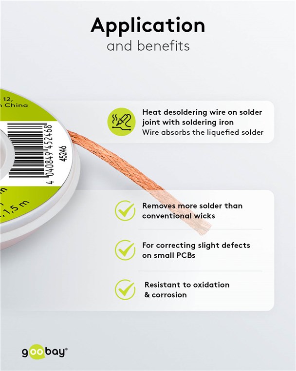 • Helpful tool for removing solder residues. Place the desoldering wire on top of the solder joint and heat with the soldering iron to remove