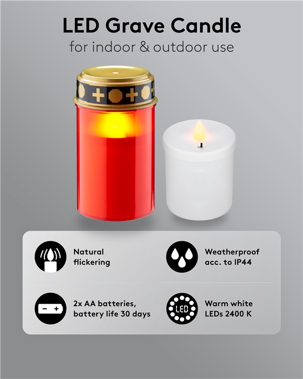 - The grave light is suitable for indoor and outdoor use - thanks to its IP44 protection rating and the waterproof battery compartment inside the candle