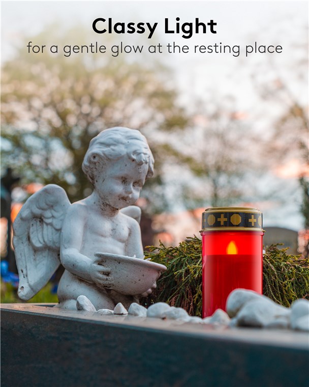 The grave candle creates an atmosphere of warmth and devotion in the cemetery, at resting places and memorials, especially at dusk and in the darker months of the year. The gently glowing light not only accompanies you in moments of remembrance, but also withstands wind and weather - for a reliable, long-lasting light at the final resting place.