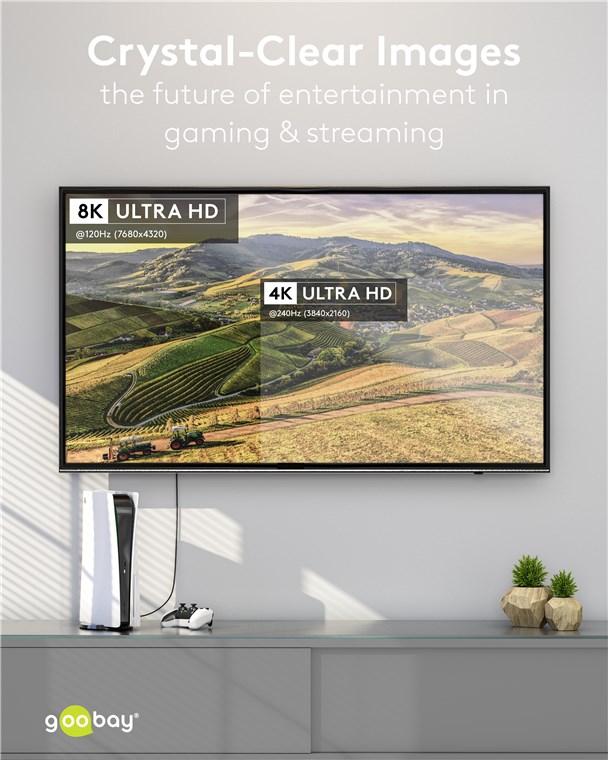 - Câble 8K spécialement conçu pour le jeu. Des images fluides sans saccades grâce à des taux de rafraîchissement élevés jusqu'à 240 Hz (en fonction de la carte graphique et de l'écran)