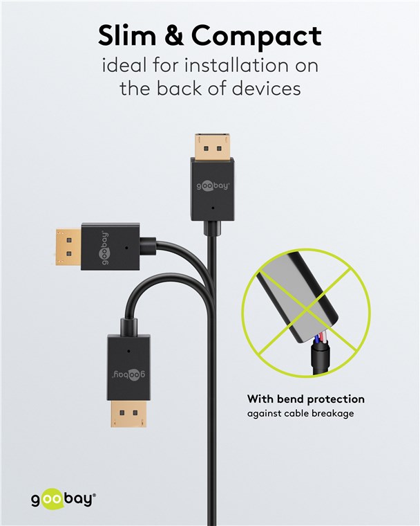 Le câble DisplayPort™ convainc à trois égards : Câble ultra-mince, connecteurs ultra-courts et rayon de courbure ultra-réduit. Ces trois facteurs rendent le câble parfait pour l'installation à l'arrière des appareils et partout où l'espace est limité. Avec une résolution d'image ultra-haute de 8K pour des images d'une grande netteté et une fonction multi-écrans à haute fréquence, le câble DisplayPort™ est le choix idéal pour les jeux immersifs et les expériences de divertissement à domicile captivantes.