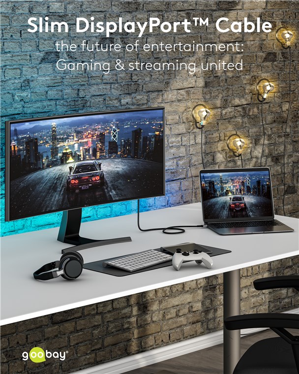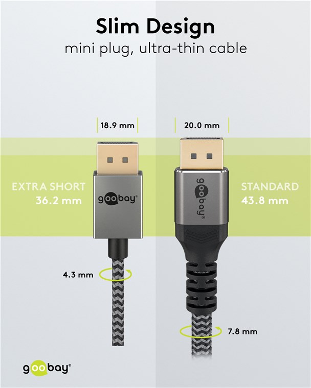 La série Plus de Goobay au design métallique élégant en Sharkskin Grey convainc à trois égards : Câble ultra-mince, connecteurs ultra-courts et rayon de courbure ultra-réduit. Ces trois facteurs rendent le câble parfait pour l'installation à l'arrière des appareils et partout où l'espace est limité. Avec une résolution d'image ultra-haute de 8K pour des images d'une grande netteté et une fonction multi-écrans à haute fréquence, le câble DisplayPort™ est le choix idéal pour les jeux immersifs et les expériences de divertissement à domicile captivantes.