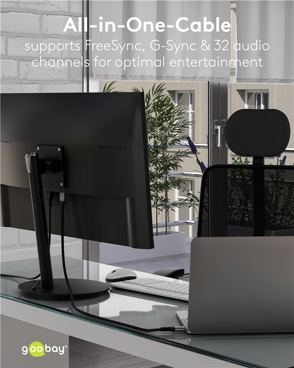 - Le câble de moniteur pour une transmission de signal haute résolution jusqu'à 8K @ 120 Hz ou 4K @ 240 Hz ainsi qu'un débit de données jusqu'à 40 Gbit/s