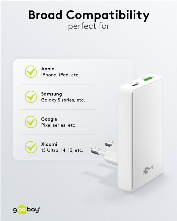 - Grâce à sa forte puissance de 65 W et au port universel USB-C™, l'adaptateur de charge alimente pratiquement tous les appareils, du smartphone à l'ordinateur portable haute performance
