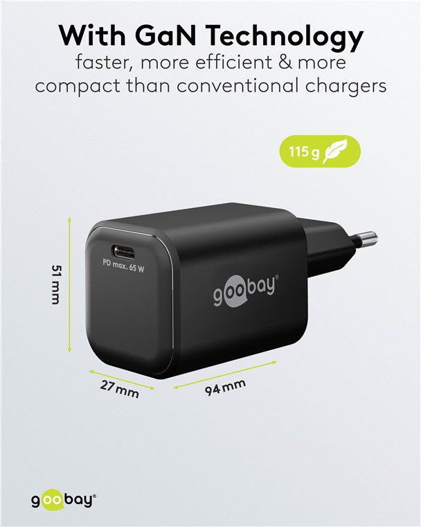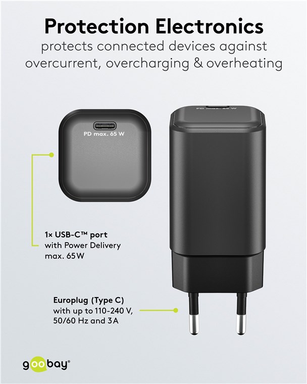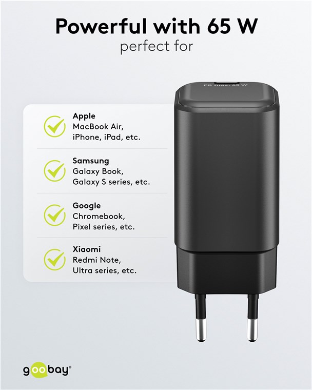 - Grâce à sa forte puissance de 65 W et au port universel USB-C™, l'adaptateur de charge convient à pratiquement tous les appareils - du smartphone à l'ordinateur portable haute performance