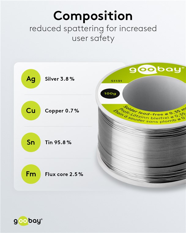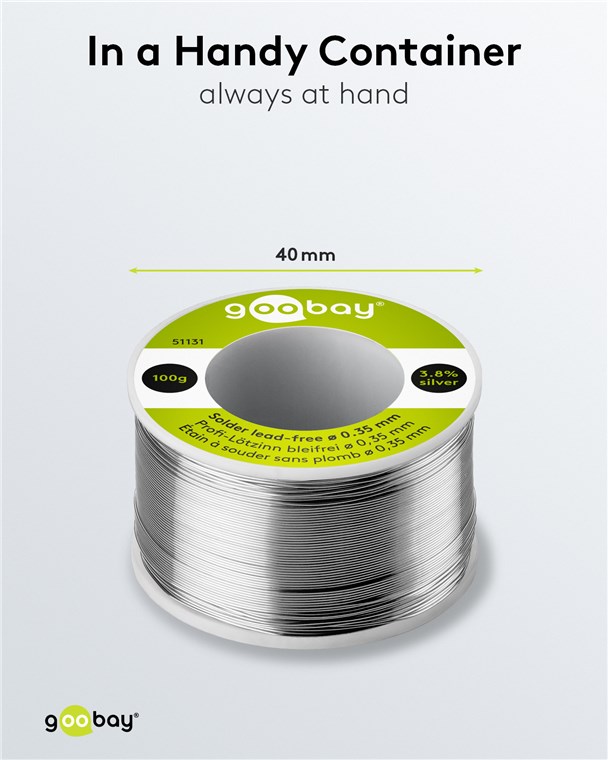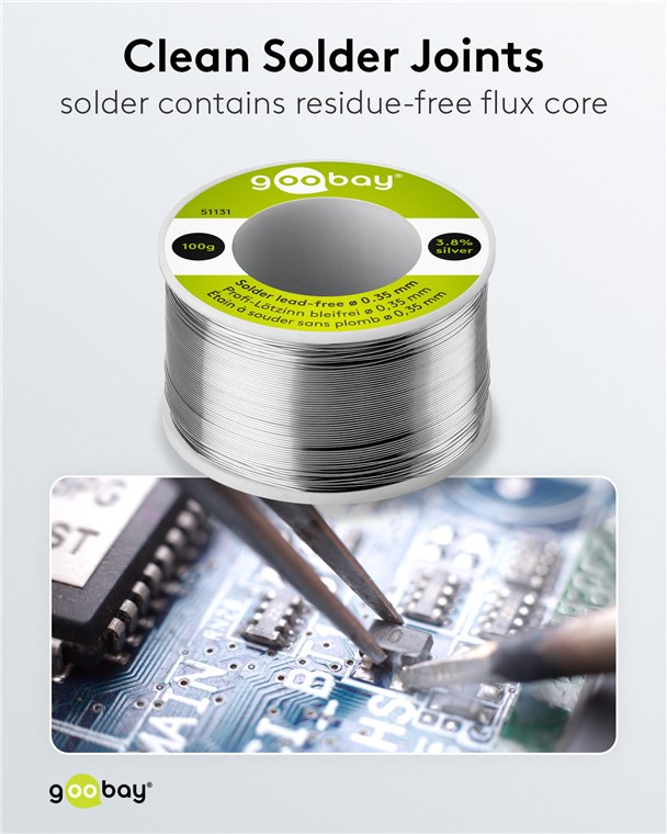 Convient pour les travaux de soudure sur les composants et appareils électriques tels que les circuits imprimés, les PCB, les SMD, les DIP, les câbles, les téléviseurs, les écouteurs ou les microphones. Pour une soudure particulièrement facile et efficace, le flux est déjà incorporé dans l'étain.