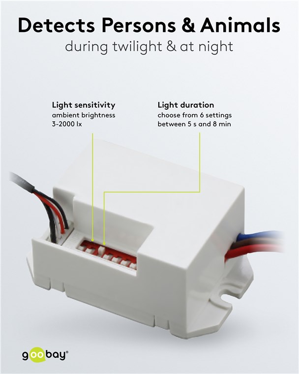 - La sensibilité à la lumière (3 lx à 2000 lx) et le délai d'extinction en 6 niveaux (5 s à 8 min) peuvent être facilement réglés derrière le cache à l'aide d'un commutateur DIP