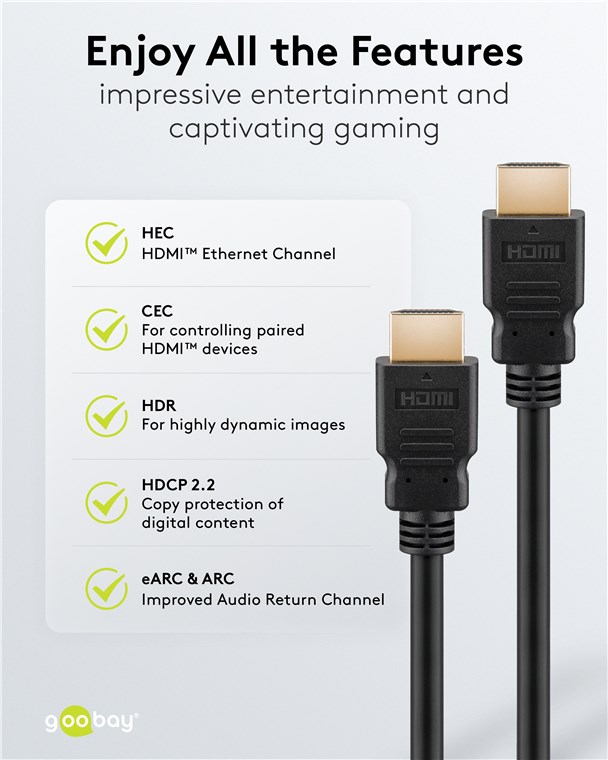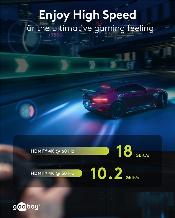 - Le câble permet une transmission d'images haute résolution en Ultra HD jusqu'à 4K @ 60 Hz (rétrocompatible) et un débit de données pouvant atteindre 18 Gbit/s