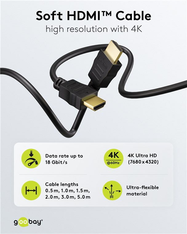 La flexibilité est reine : Ultra-souple et ultra-flexible, ce câble est la solution idéale pour tous les ports HDMI™ situés dans des espaces restreints, par exemple derrière le téléviseur ou sous votre écran. Sa conception flexible empêche efficacement les ruptures de câble et garantit une longévité extrême. Connexion simple, confort maximal. Pour des expériences de divertissement captivantes dans une résolution 4K cristalline.
