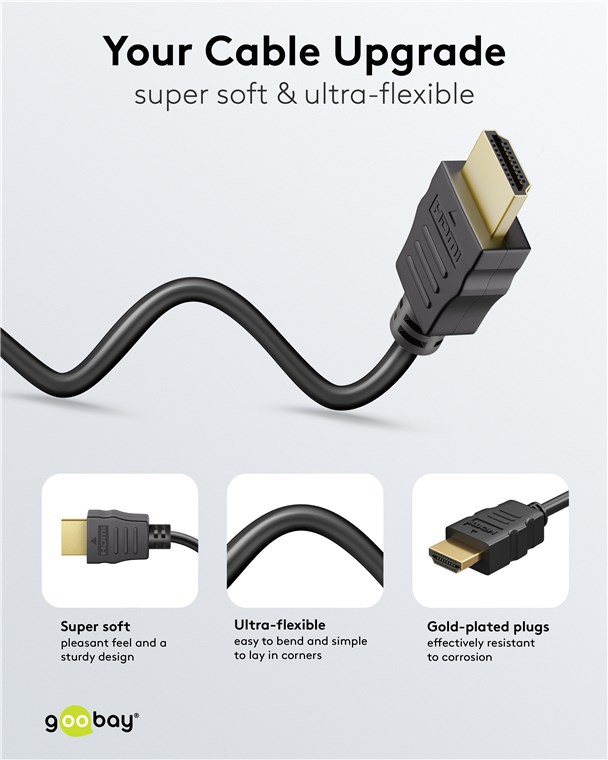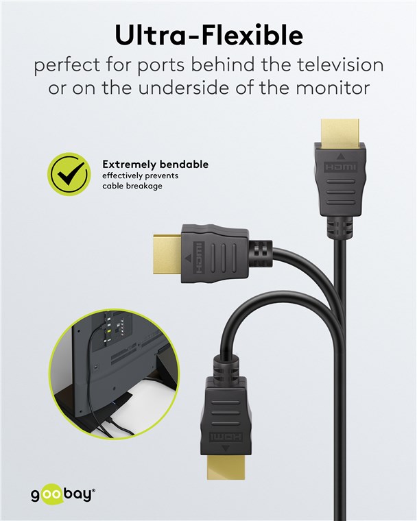 - Ultra-souple et ultra-flexible : La gaine souple du câble garantit un acheminement facile avec un rayon de courbure réduit, parfait pour les espaces restreints, p. ex. derrière le téléviseur