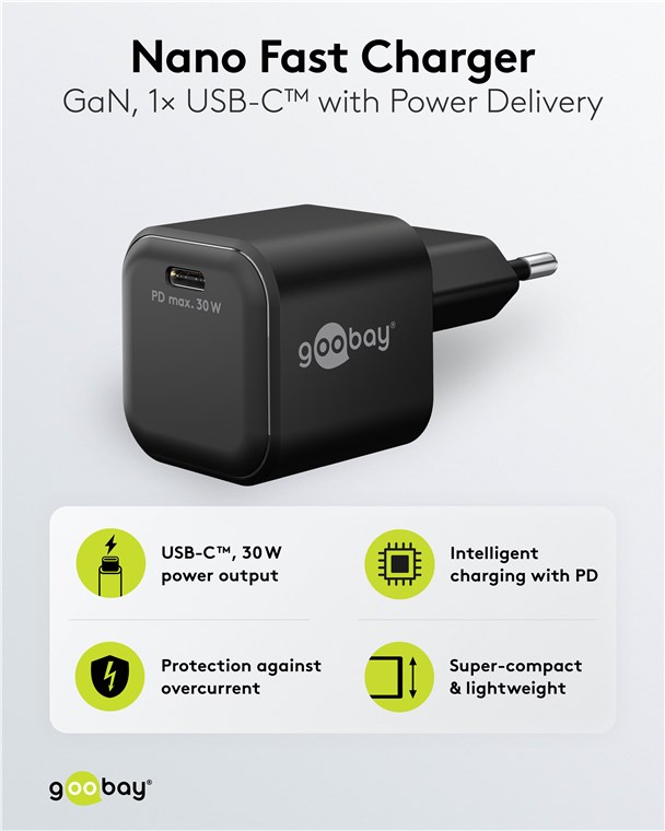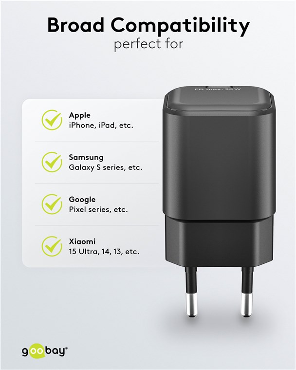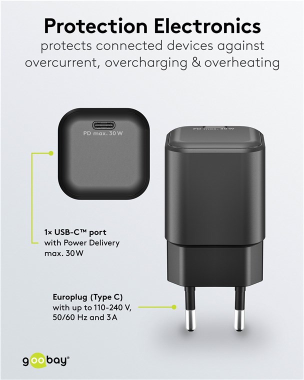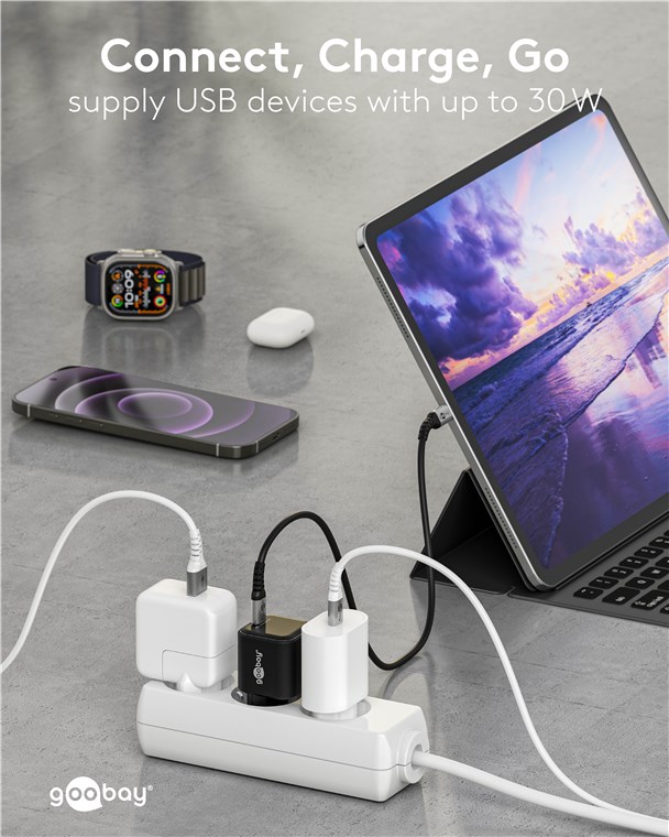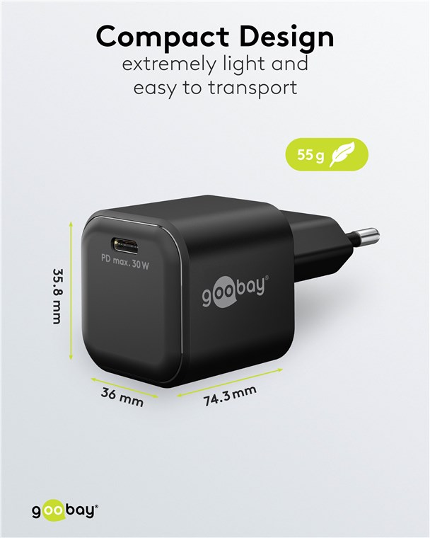 - Con una potenza di 30 W, l'adattatore di ricarica è particolarmente adatto a dispositivi piccoli come smartphone, cuffie Bluetooth, tablet o power bank