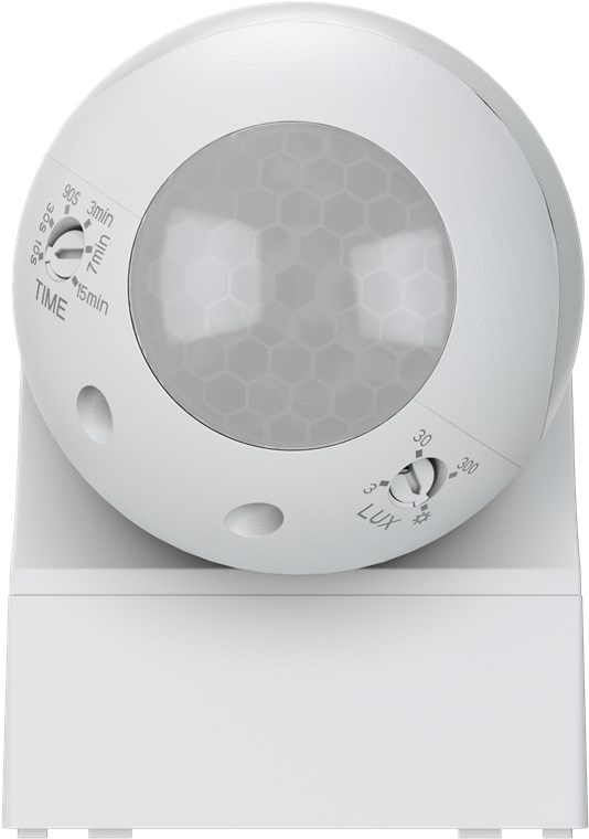 - La sensibilità alla luce (3 lx a 2000 lx) e il ritardo di spegnimento (da 10 s a 15 min) possono essere regolati in modo semplice e continuo tramite la manopola situata nella parte inferiore