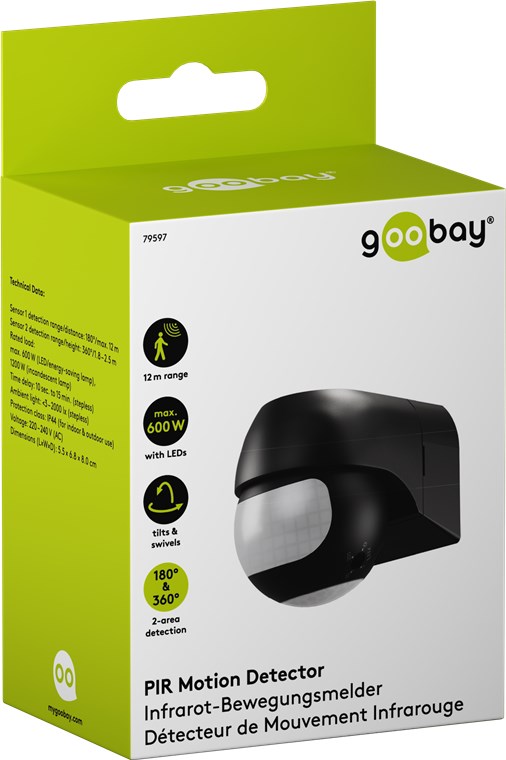 Vento e intemperie? Nessun problema, il rilevatore di movimento con grado di protezione IP44 è perfetto per gli spazi esterni come giardini, tettoie per auto o ingressi di casa. I 2 sensori a infrarossi reagiscono ai movimenti provenienti in direzione orizzontale e dall'area sottostante il dispositivo, rendendo il rilevatore di movimento particolarmente pratico per un'installazione in posizione rialzata. Rilevatori di movimento di Goobay – una sensazione di sicurezza.