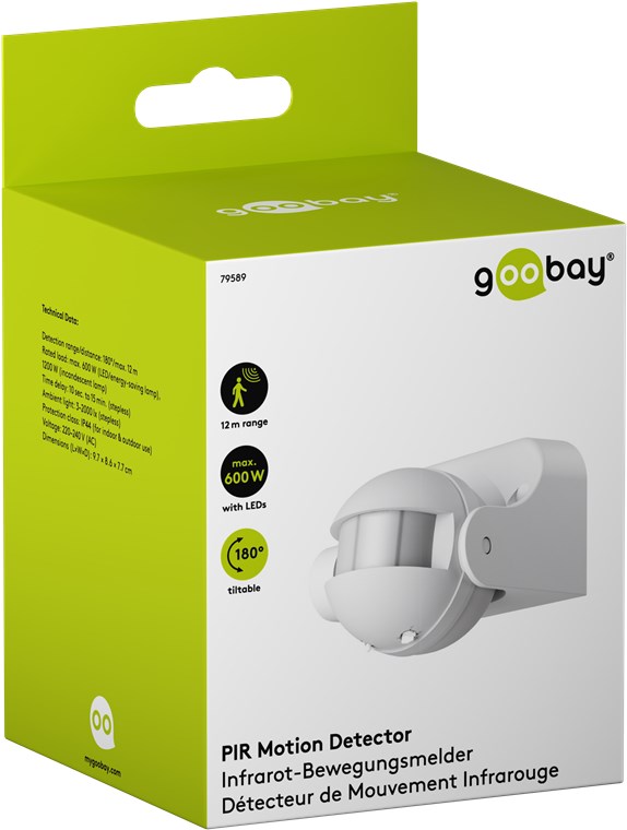 Vento e intemperie? Nessun problema, il rilevatore di movimento con grado di protezione IP44 è perfetto per gli spazi esterni come giardini, tettoie per auto o ingressi di casa. Basta collegarlo all'illuminazione esterna o di passaggio per evitare di inciampare al crepuscolo e al buio. Rilevatori di movimento di Goobay – una sensazione di sicurezza.