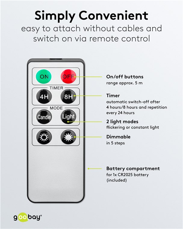 - Świece na baterie: 1x AAA każda, pilot: 1x CR2025 (w zestawie)