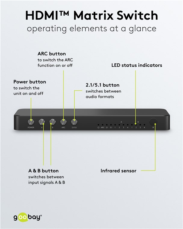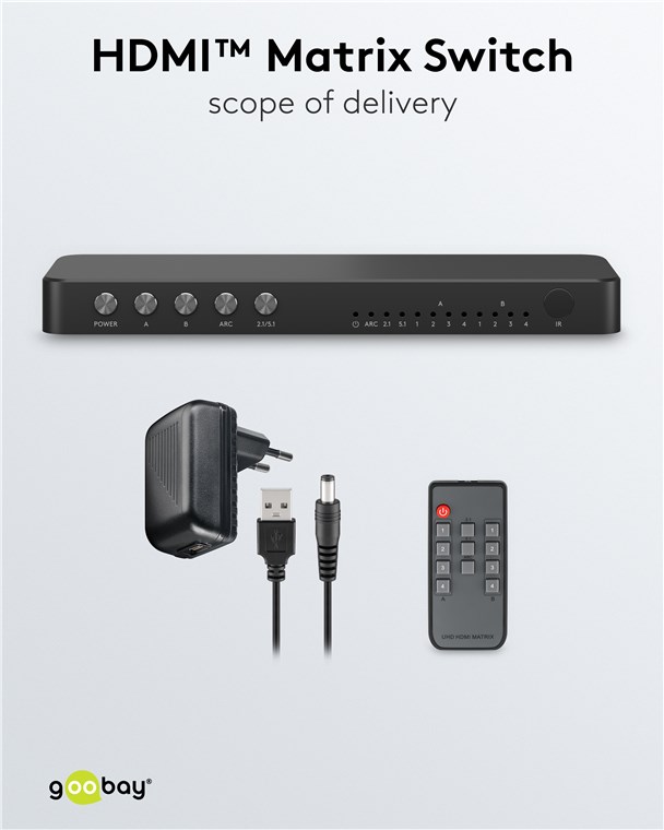 Użyj przełącznika matrycowego, aby uzyskać maksymalną elastyczność przy podłączaniu ekranów HDMI™ i urządzeń końcowych. Przełącznik pozwala na przełączanie pomiędzy różnymi źródłami i terminalami za pomocą pilota, bez kłopotliwego ponownego podłączania kabli.