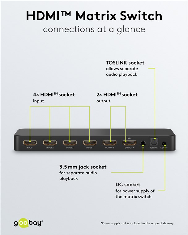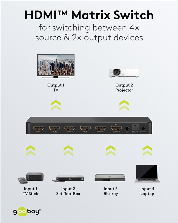- Przełącznik HDMI™ przesyła do 4x sygnałów wejściowych HDMI™ do 2x wyjść, umożliwiając odtwarzanie obrazu i dźwięku na wielu urządzeniach, takich jak telewizor, projektor czy monitor.