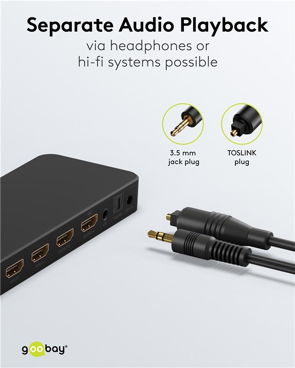 - Gniazdo TOSLINK i 3,5 mm jack umożliwiają oddzielne odtwarzanie dźwięku np. przez system hi-fi, soundbar lub słuchawki