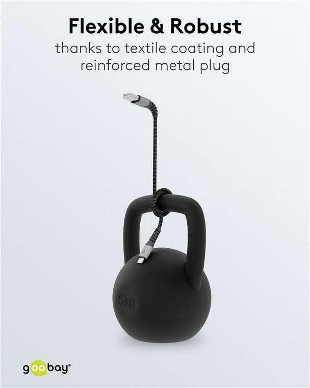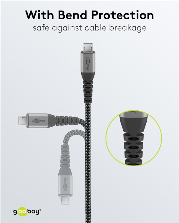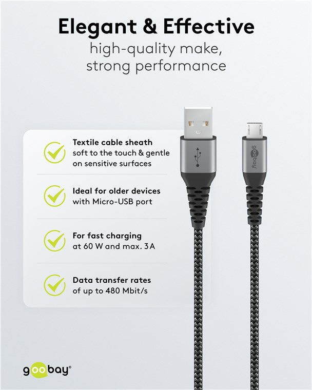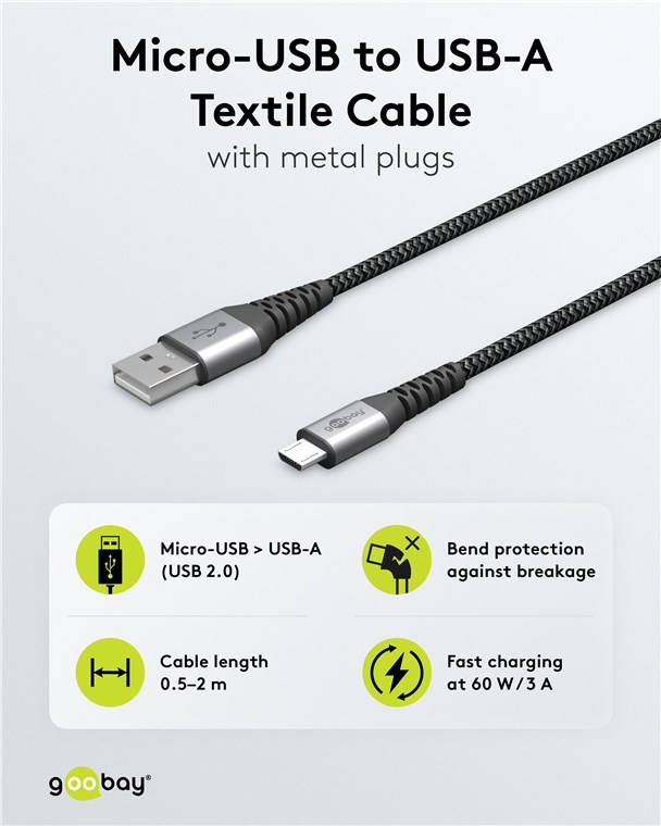 - Kabel ładujący Micro-USB firmy Goobay do szybkiego ładowania o maksymalnym natężeniu 3 A.